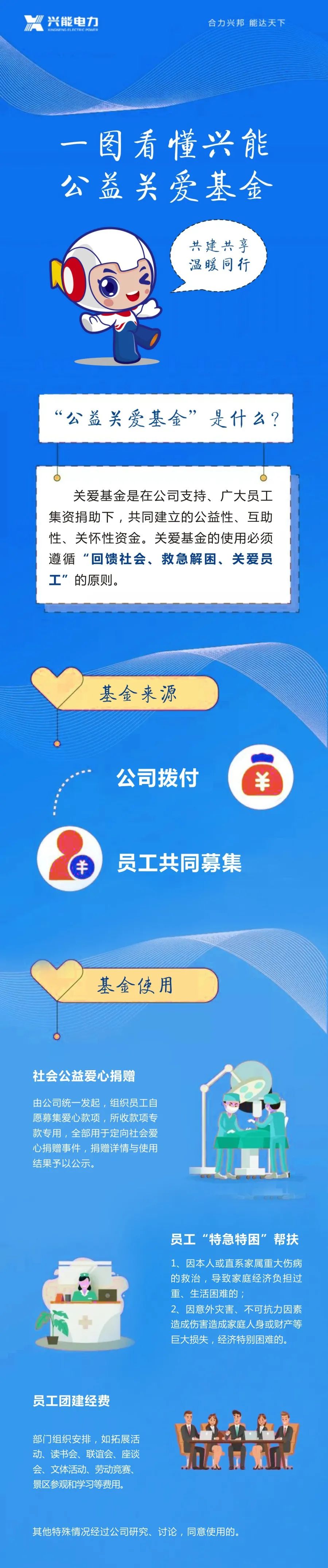 萬眾同心,大愛無疆。關愛基金通過企業(yè)與員工共建,公益與保障共融的形式,踐行社會責任,為員工解除后顧之憂。匯聚愛心,與員工共創(chuàng)幸福,共享成長,在公司快速發(fā)展的同時,回饋社會,盡“興能”之力,關愛每一個“家”。