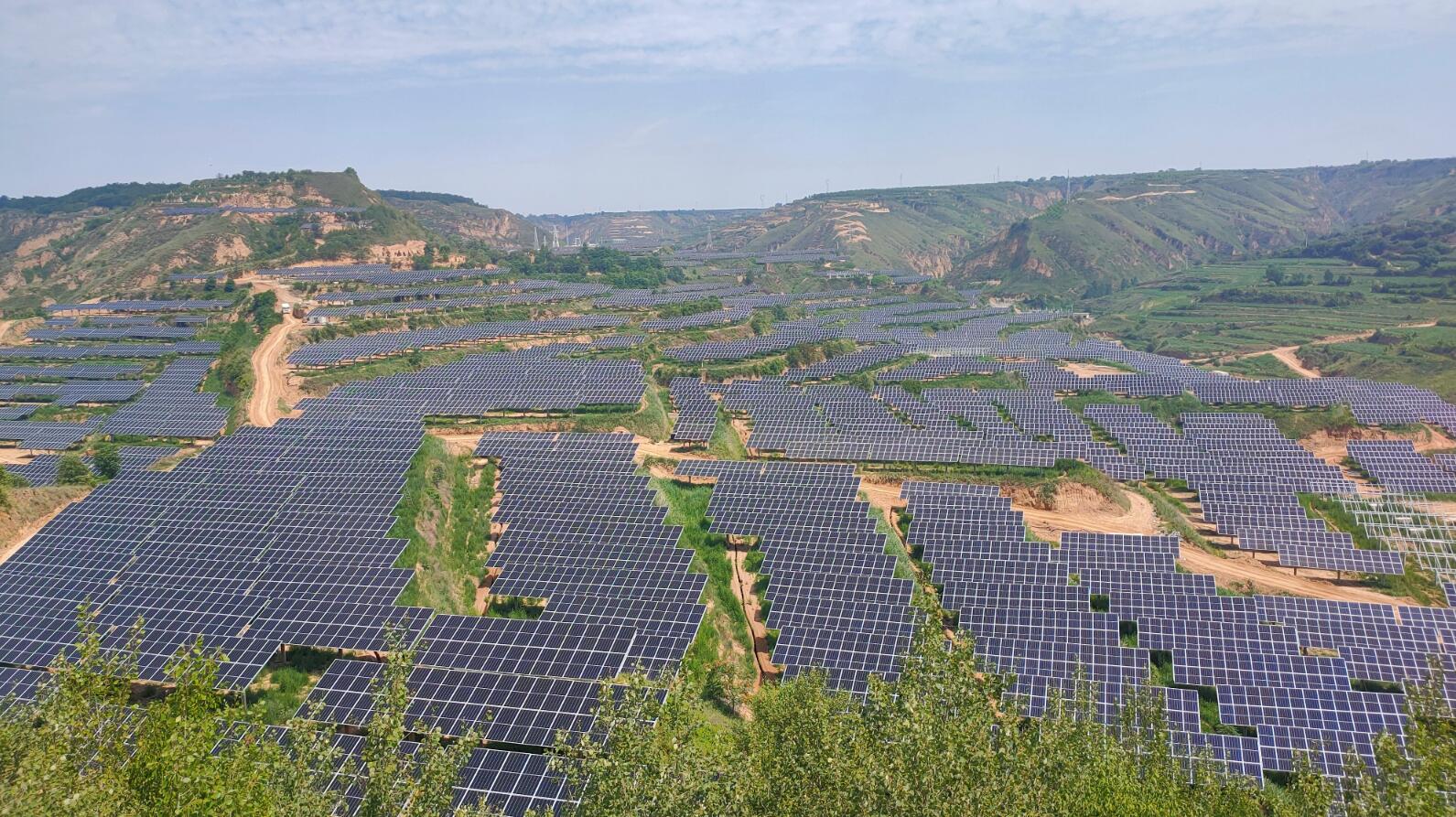 如今昔日的黃土大溝已大變樣,藍天白云下,高低錯落的山坡上,幾萬片藍色光伏板沿山坡斜鋪開,已然成為了黃土高坡上一道獨特美麗的“藍色海洋”。